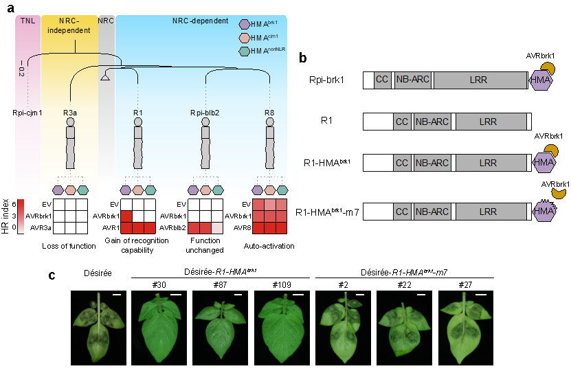 更为令人振奋的是,研究团队发现将Rpi-brk1的HMA结构域“嫁接”到已失效的抗晚疫病蛋白R1的末端后,可使原本仅识别AVR1的R1同时识别AVRbrk1,从而拓展了抗病谱(图2)。这种“即插即用”的基因设计思路为快速培育广谱抗病品种提供了全新思路。研究团队将其命名为“结构域插件”(plug-in)育种策略。研究表明,将R1的LRR结构域末端添加Rpi-brk1的HMA结构域,能使R1获得对AVRbrk1的识别能力。这一策略有望突破转基因壁垒,通过基因编辑手段,将特定功能域精准嵌入作物原有抗病基因,实现广谱抗性的创制。